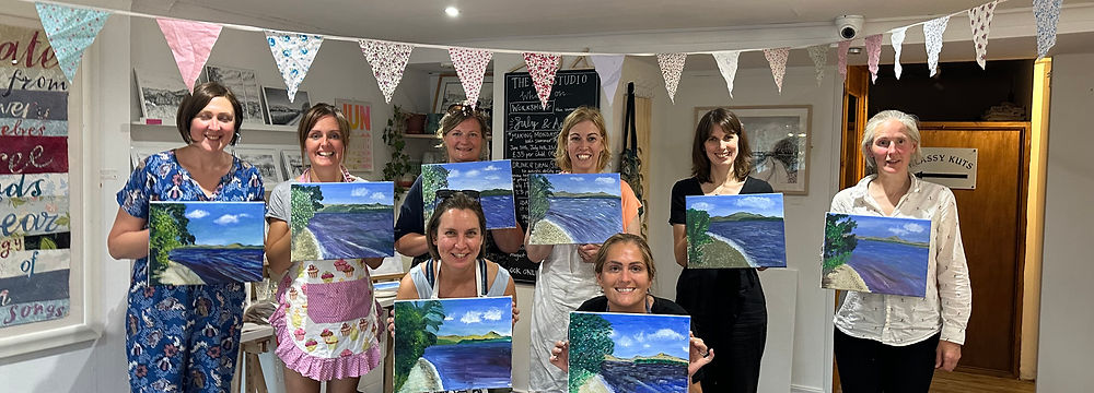 Fancy a different kind of night out with friends? Why not book a Sip and Paint fun night at The Art Studio. Bring a bottle...or a few and be guided through a step by step painting night. Choose an available date from our booking calendar. The space can accommodate up to 12 people. You can choose what painting theme you would like to go for-landscape, seascape, floral, abstract etc. We provide all materials, aprons, chocolates and crisps plus glass flutes, all you need is to BYOB and yourselves.